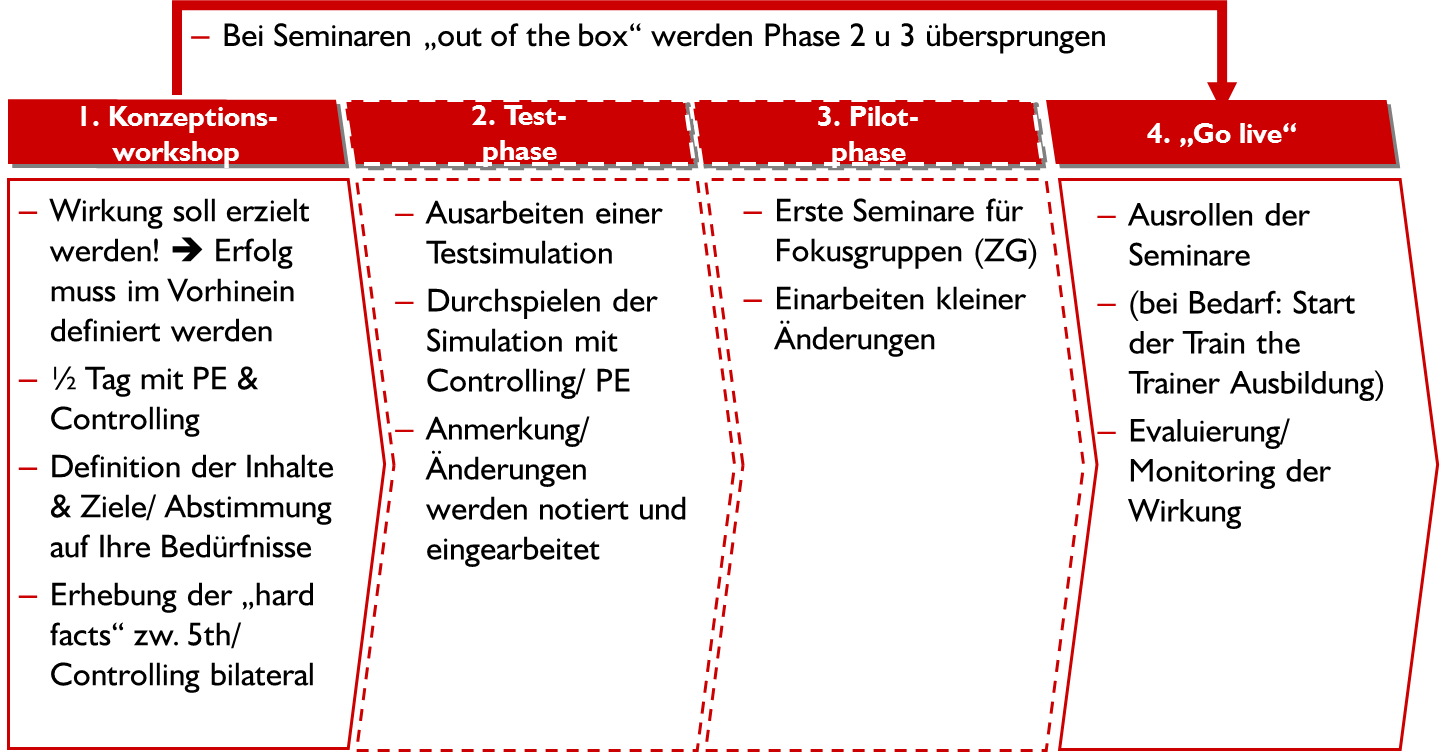 Zum Zweck der Konzeption eines maßgeschneiderten Pilotseminars bieten wir Ihnen einen Termin mit Mitarbeitern aus dem Controlling/ der Finanzabteilung, sowie der Personalabteilung zur Festlegung der genauen Inhalte an. Diesen 2-3 stündigen Workshop bieten wir Ihnen bei Buchung von zumindest 5 Seminaren im ersten Jahr kostenlos an.
